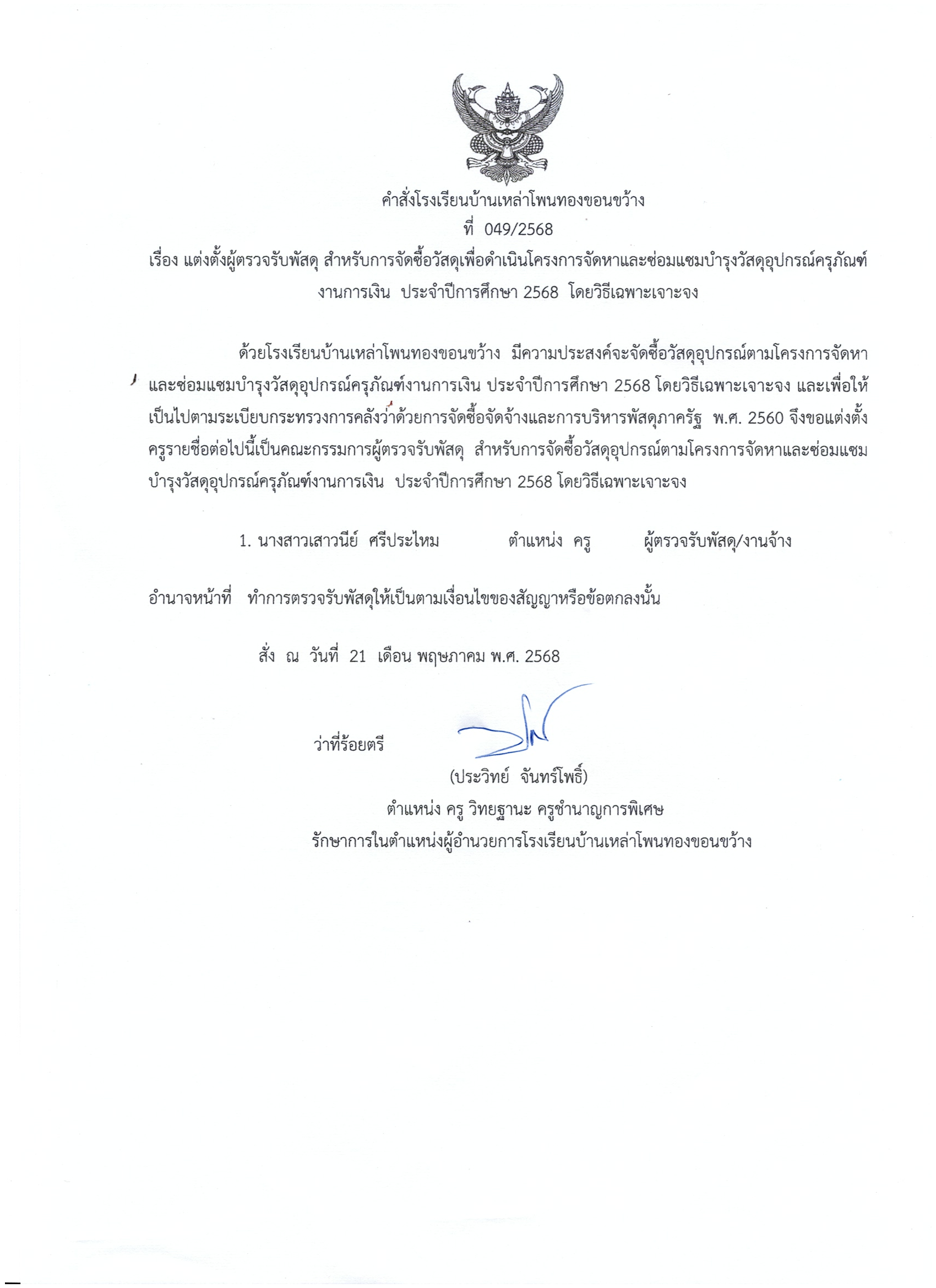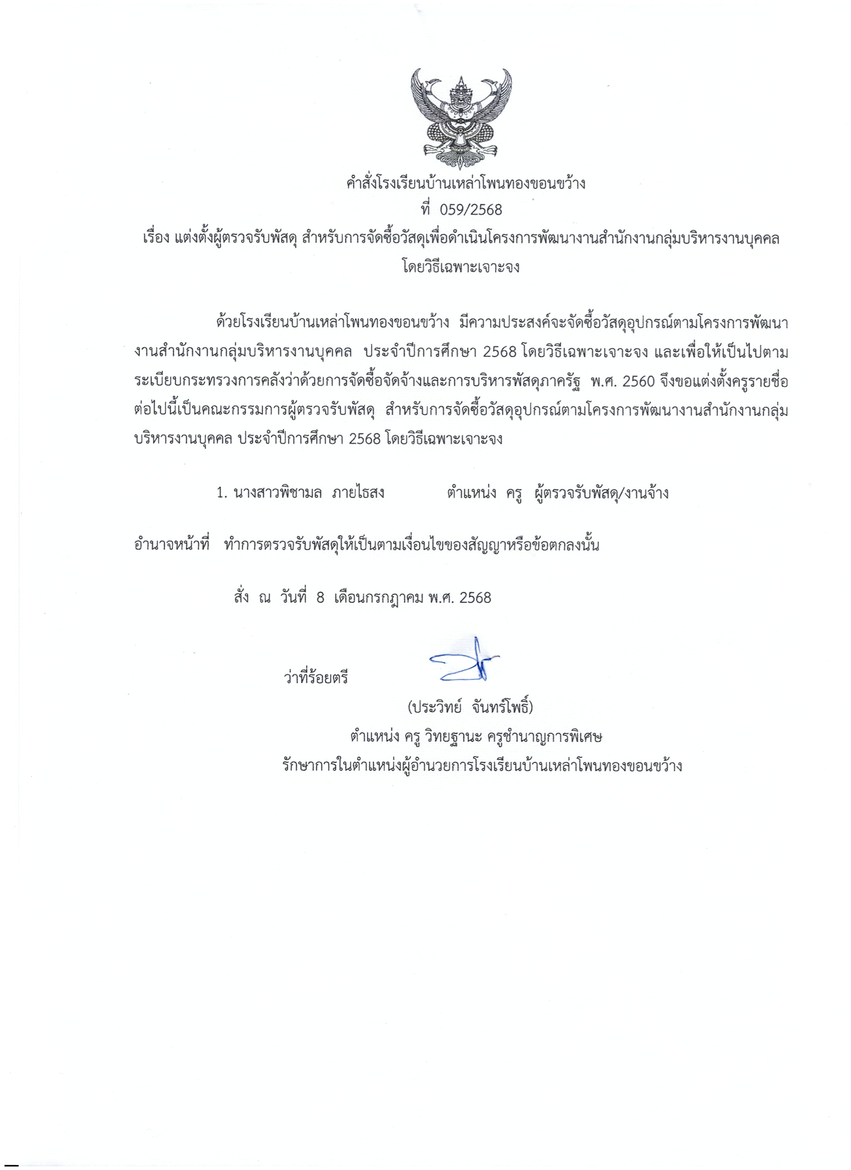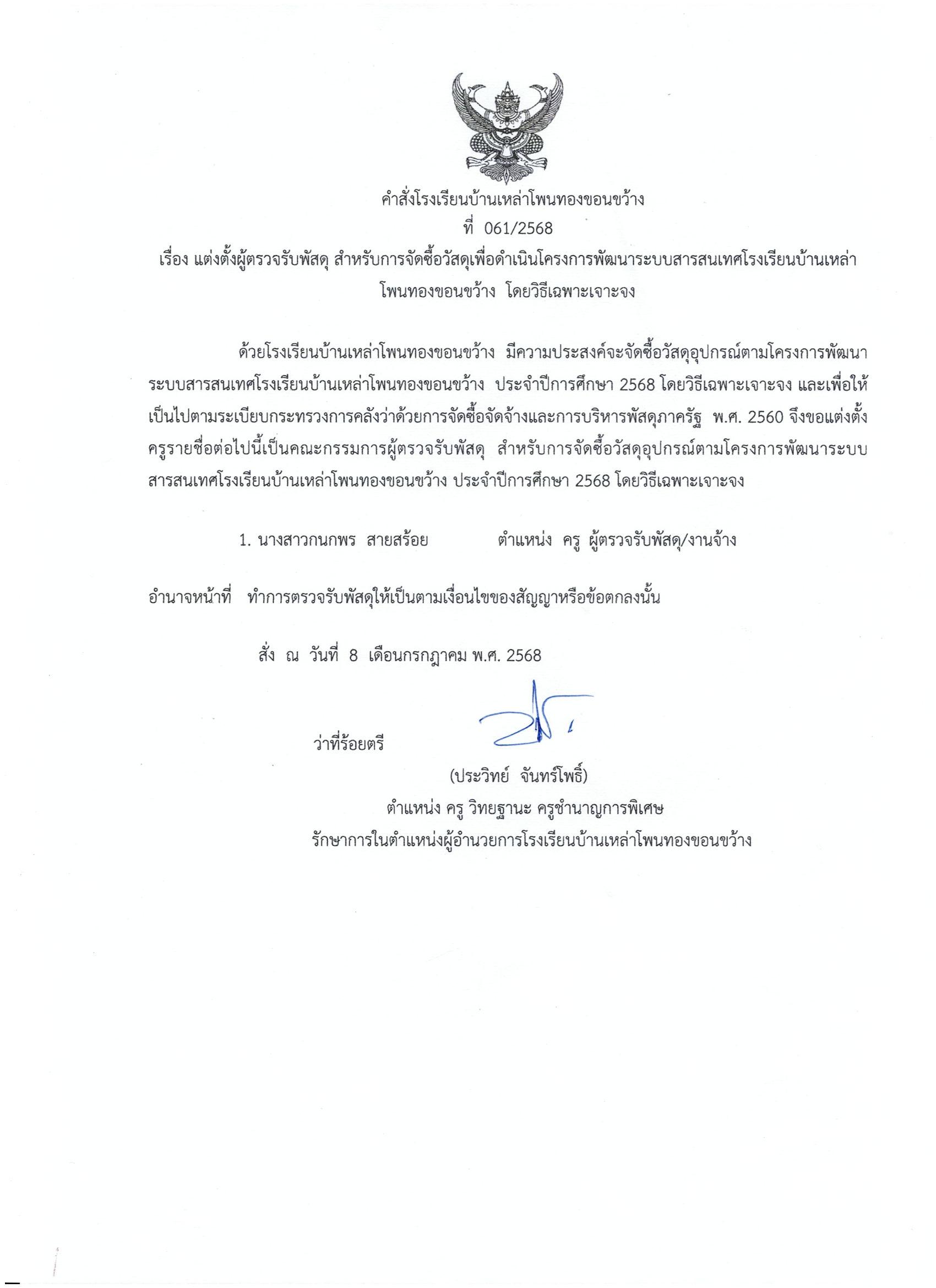 61/2568คำสั่งแต่งตั้งคณะกรรมการตรวจรับพัสดุการจัดซื้อวัสดุอุปกรณ์ดำเนินโครงการพัฒนาระบบสารสนเทศโรงเรียนบ้านเหล่าโพนทองขอนขว้าง 26 ก.ค. 68